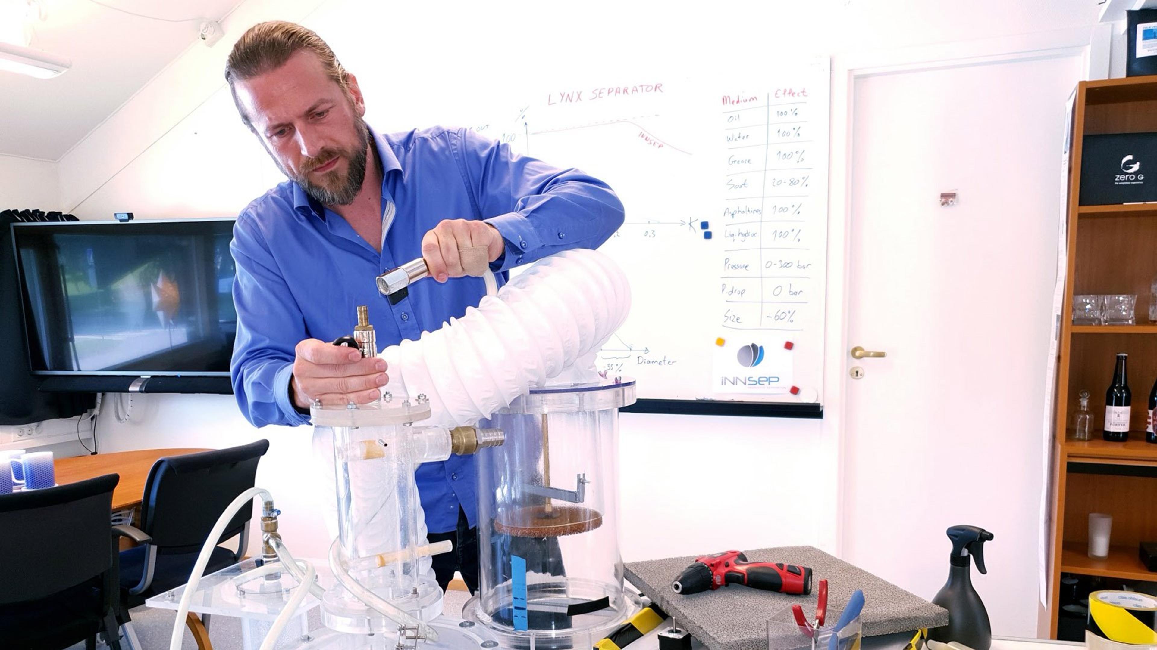 - Vi har testet filteret i separatoren vår med en rekke stekeoljer og vann, og ingen dråper eller partikler har kommet igjennom – ikke engang lukten. Prosessen er veldig effektiv, forteller daglig leder i InnSep, Sondre Klæboe Jacobsen.