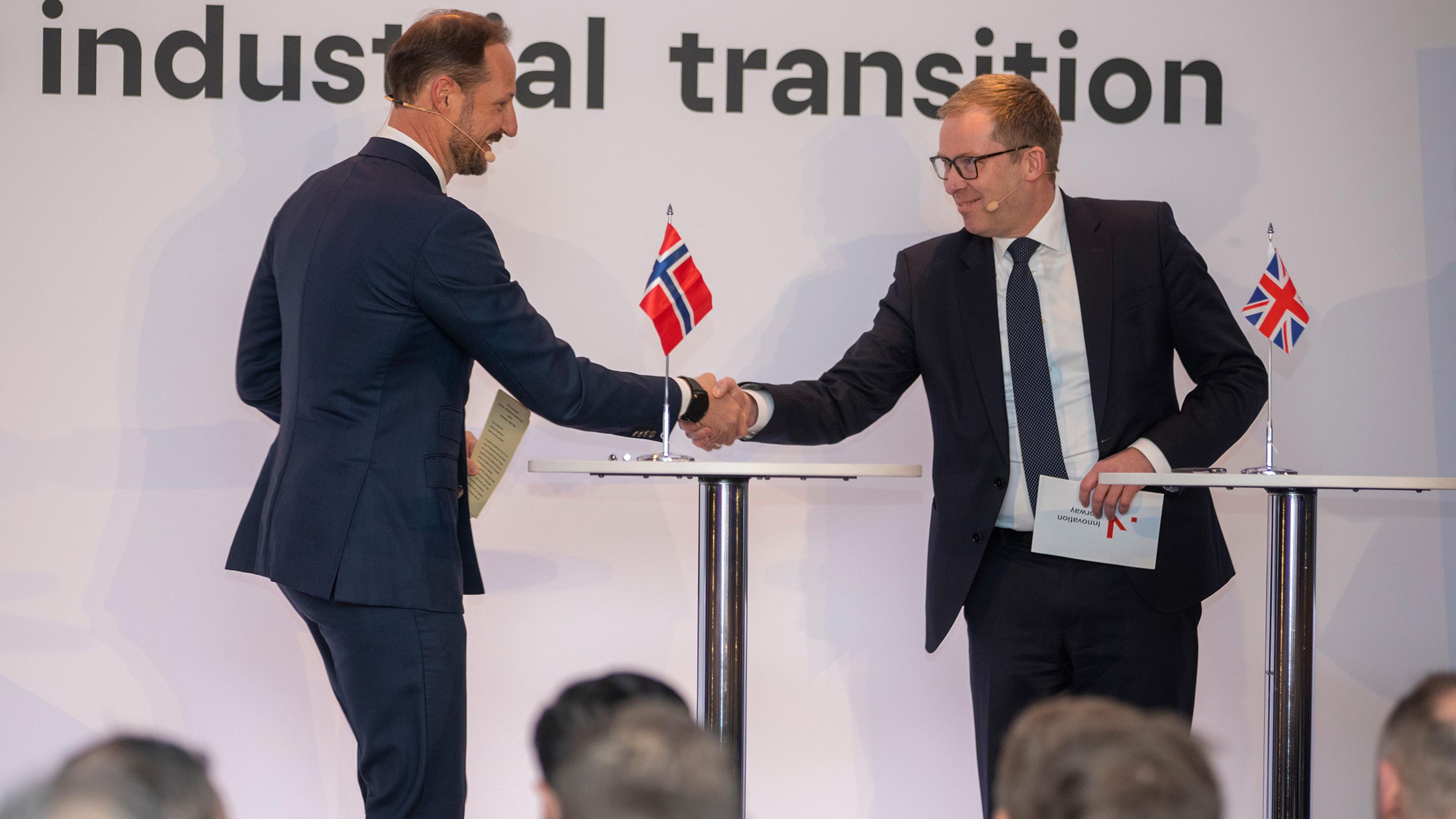 Kronprinsparet er denne uken på offisielt besøk til Storbritannia. Kronprinsparet ledsages av utenriksminister Anniken Huitfeldt som var til stede på scenen sammen med den britiske energiminsteren Grant Shapps. Sammen undertegnet de en intensjonsavtale om samarbeid på hydrogen, som en forlengelse av allerede inngått samarbeid på karbonfangst- og lagring. (Les mer om hydrogensamarbeidet i Regjeringens pressemelding)