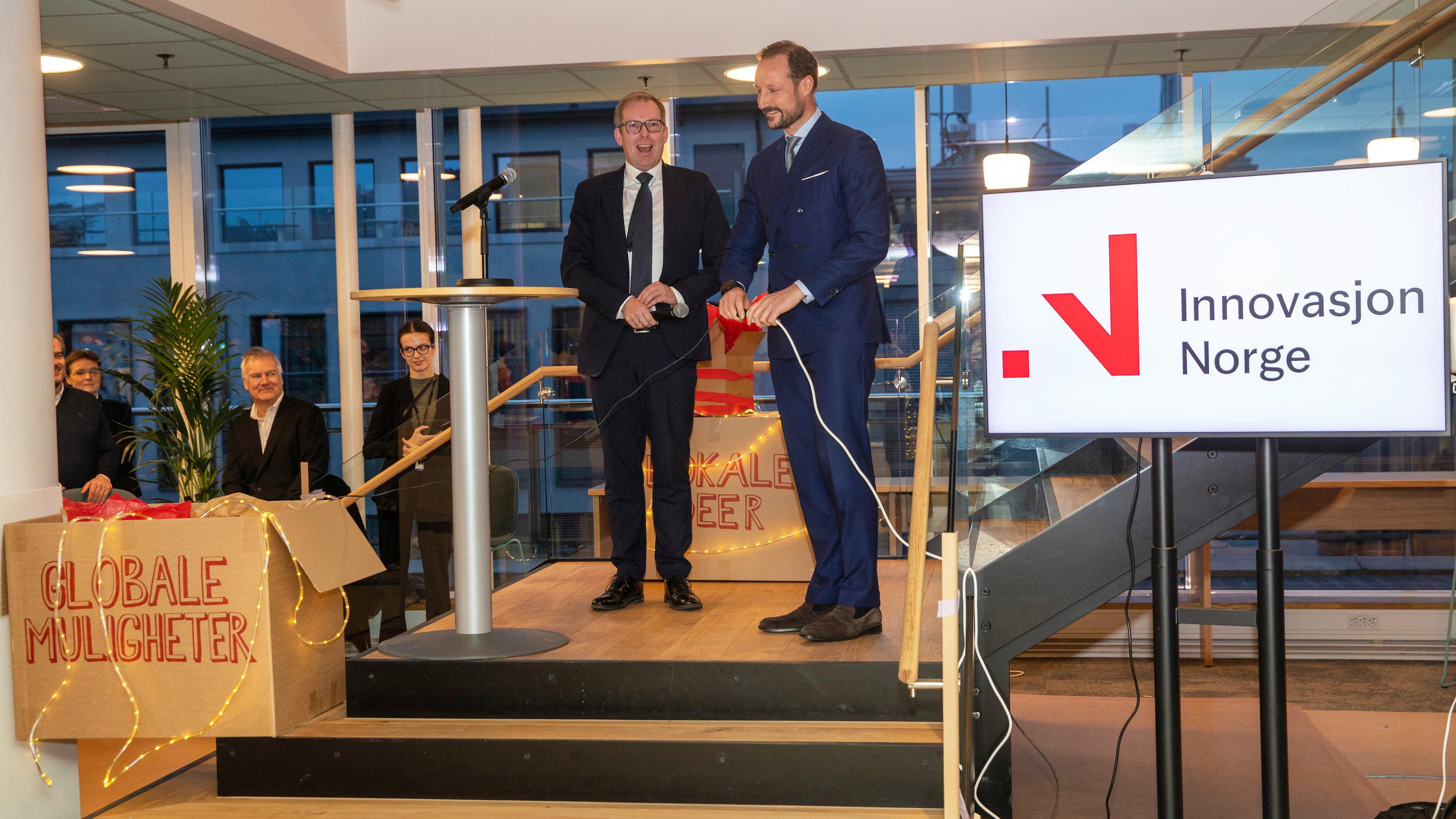 Kronprins Haakon sørget sammen med administrerende direktør i Innovasjon Norge, Håkon Haugli, for å koble strømmen fra lyskilden “lokale ideer” til “globale muligheter” på podiet under åpningen av det nye hovedkontoret.